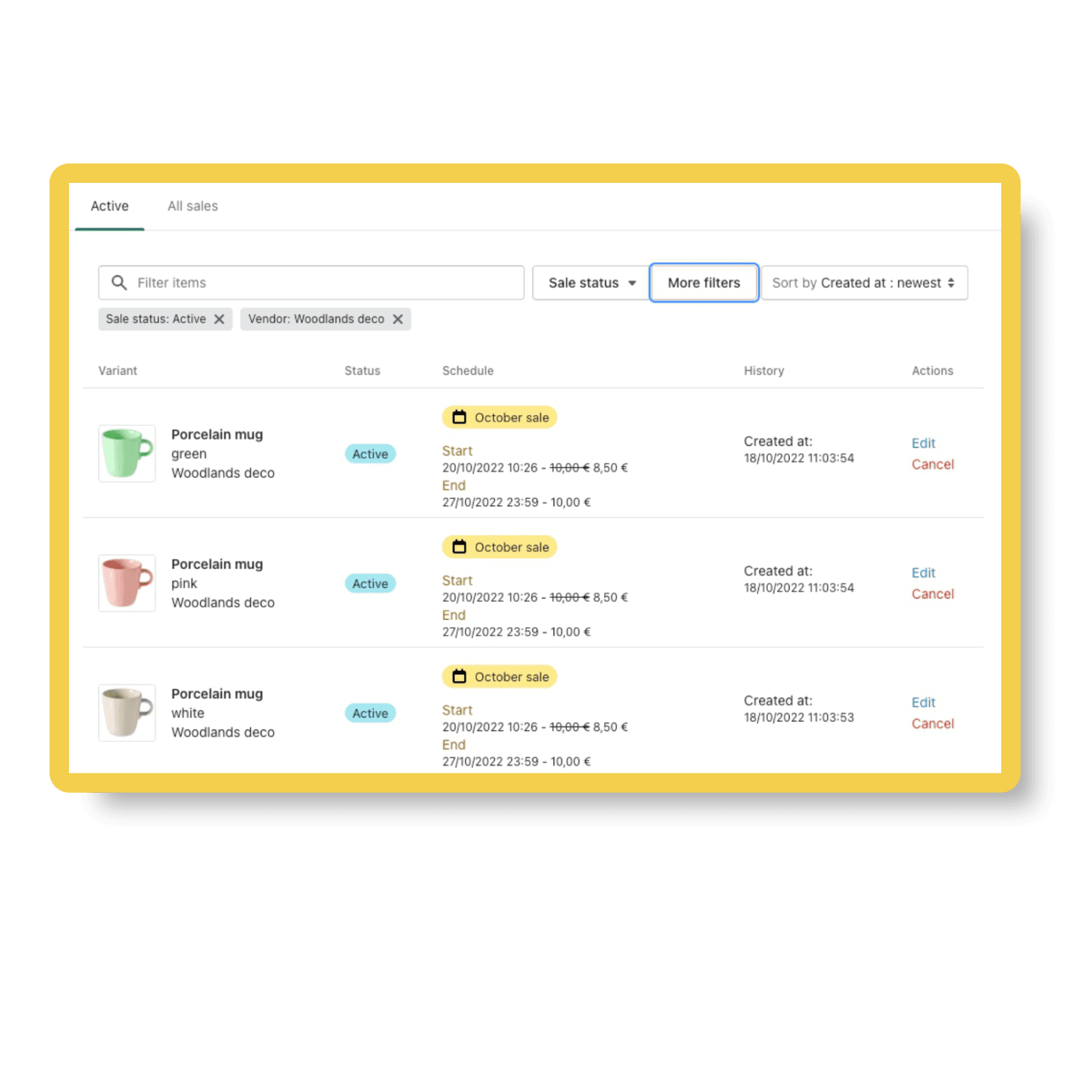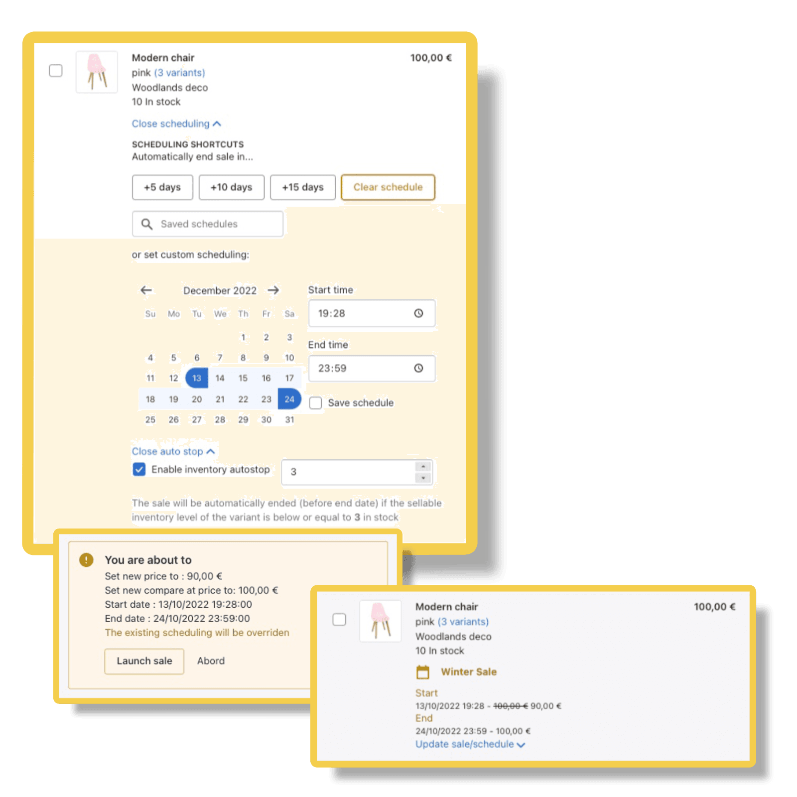- Create, schedule and manage sales for a single variant or in Bulk.
